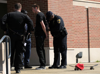Police said the man, whose name they would not release at the arrest scene, was skateboarding on campus near the Scramble Light when an officer warned him to stop. The man ignored the officer, who then chased him to the top of the steps outside the northwest entrance to the Music Instruction Building, police said.