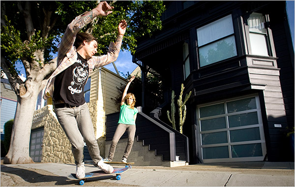 The New York Times knows skateboarding is cool. And what better way to show how hip a young couple can be than by profiling Jay Shapiro and Claire Bigbie at their wonderfully skatie pad in San Francisco’s trendy Noe Valley neighborhood. The profile is filled with lines like these: