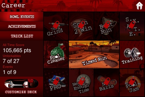 After mastering freeride mode, career mode sent us on a toward 10 different events with evolving goals including pool cleaner, the grind, pro, Spin 2 win, Never enough time, best run, S.K.A.T.E, No Bails, and finally pool jam. The goals definitely made us spend more time on the game, but with no new pools to skate it wasn’t as motivating as we’d have wished.