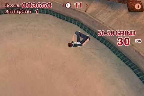 Controlling the skaters is touted as being as easy as tipping the iPod touch in the right direction. Want Bucky to roll to his right, tilt the iPod that way. Which way the skater turns however is based on which way he is going. The thing that messed us up initially is that because there are no set left and right (as there would be with buttons) the game has a little of that Wii remote softness were we sometimes had no idea what our movements were doing to the skateboarder on the screen.