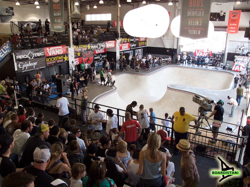 Grind, snake, grind, mumble, mumble, Tony Alva, yeah, Tony Alva, Chris Miller, Bucky Lasek, near-miss, near-miss, Captain and Casey dressed a pool boys, Red in a mirror-shaded speedo, loud, loud, loud, Steve Van Doren flipping burgers, Steve Alba stretching, huge air, Dave Duncan on the mic and we can’t understand a word, Steve Luther staring Conversations, a girl skating in a skirt, winks from Rob Brink, Lyn-Z Adams Hawkins all grown up, Doug Paladini shaking hands, T-Mag, Bryce Kanights, Joel Gomez, Daily Habit Director Jen Goodman, Chris Overholser on the move, Geoff Rowley lurking, Jamey Stone on a cane, Christian Hosoi and his over 30 fans, that Pedro Barros kid wrecks this place, Dave Carnie’s weird beard, Ashton Maxfield sans glasses, consultant Mike Chantry, proud dad Dennis Jenson, Mark Waters and Bob Schmeltzer, the evasively ethereal Vans_66, Bob Burnquist and his roller bag, a Hi-Def backstage tour, Carleton Curtis, Dan Maiman, and John Stouffer, Danny Kass wandering the mall in bright colors, Desiree Astorga on a curb, Rockstar on ice, kids running the park, and reports of Mos Def.