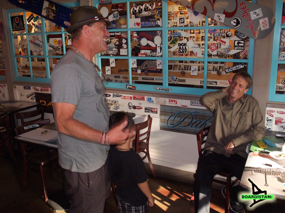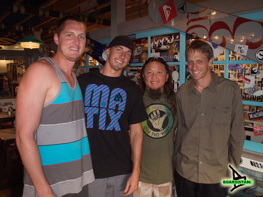 Wahoo’s Fish Taco’s promo crew Sean Gilpin and Kevin Gilpin, Wahoo’s Wing Lam and Tony Hawk.