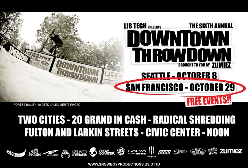 On Saturday, October 29, 2011 Lib Tech and Snowboy Productions are bringing their rails to the San Francisco Civic Center as the Downtown Throwdown hits NorCal. It all starts at Noon at Fulton and Larkin Streets. Expect a bit of a crowd, for sure.