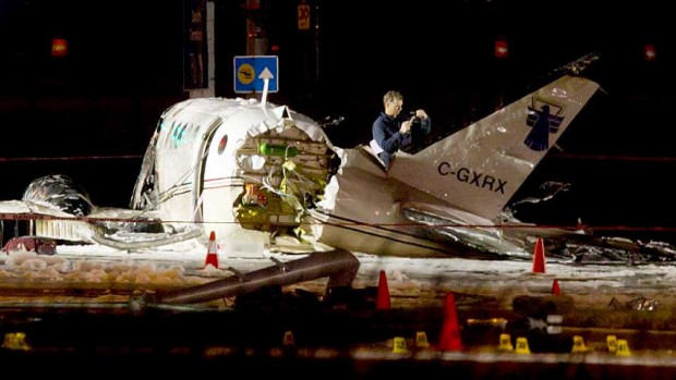 [Update 10:30 AM: According to the CBC the pilot of the plane has died due to injuries he suffered in the crash.]