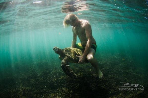 Jamie O’Brien may be in a little trouble after his apparently misguided attempt to raise awareness for a herpes-type virus” called fibropapilloma that affects sea turtles with this Brent Bielmann photo, according to a Fred Pawle story in The Australian.