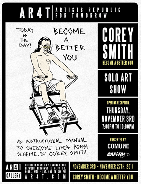 On November 3, 2011 Corey Smith will open his solo show Become A Better You at Laguna Beach, California’s AR4T Gallery.
