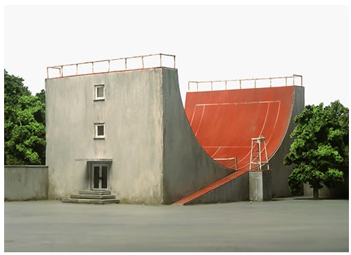 German artist Frank Kunert builds small surrealist models and then photographs them as if they are full-sized. In this piece Tennis-Halfpipe he does what Sole Tech’s Pierre-AndrĂ© Senizergue is trying to do with his PAS House in Malibu. But Kunert goes for the simple, direct approach, plus tennis.