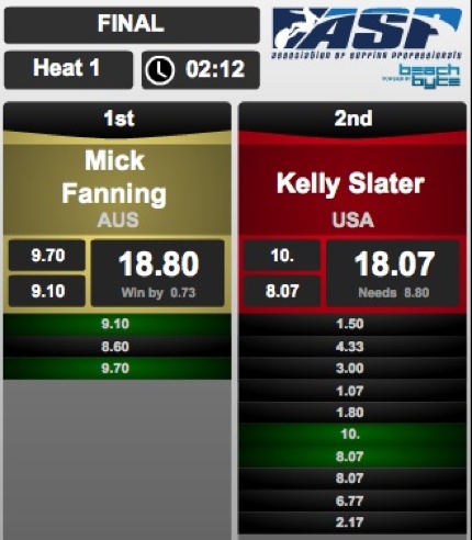 Slater fumbled around for a while, seemingly falling off every wave he caught, until finally pulling out one of the biggest air reverses in ASP history. That one air scored a 10 and put Slater back on track. But then Fanning busted out a massive 9.7. Slater was stuck for the rest of the 40 minute final hunting an 8.8. The best he could do was a pair of 8.07s (one of which he felt was horribly underscored).
