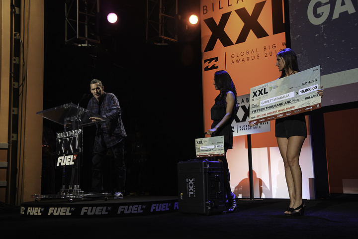 Garrett McNamara accepts the Billabong XXL Biggest Wave Award.