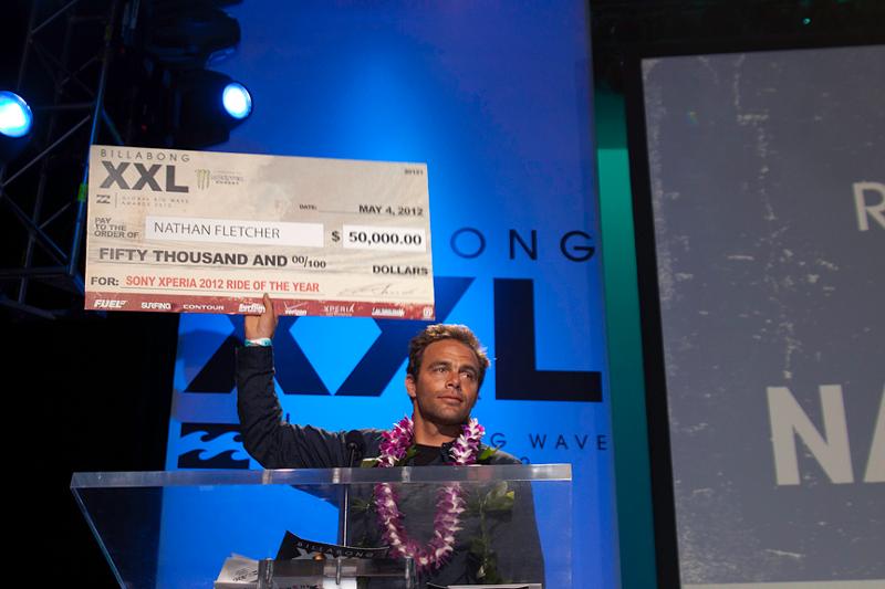 While McNamara’s rides have earned him mainstream acclaim, Nathan Fletcher (San Juan Capistrano, California, USA) walked away with the surfing industry night’s biggest prize, the 35 year-old goofy-foot winning the prestigious, blue ribbon Sony Xperia Ride of the Year Award and $50,000. Fletcher also became the first surfer in the 12-year history of Billabong XXL Global Big Awards to win three awards in the one night. The same massive wave Fletcher rode at Teahupoo in Tahiti on August 27, 2011 that earned him Xperia Ride of the Year, also won him the Monster Tube Award. In addition Fletcher was presented with the Surfline Best Performance Award that honors the male surfer showing the most consistency during the last 12 months. The humble Fletcher is a true “surfer’s surfer” — short on words, but held in high regard by his surfing peers and the global big wave fraternity for his relentless charging.