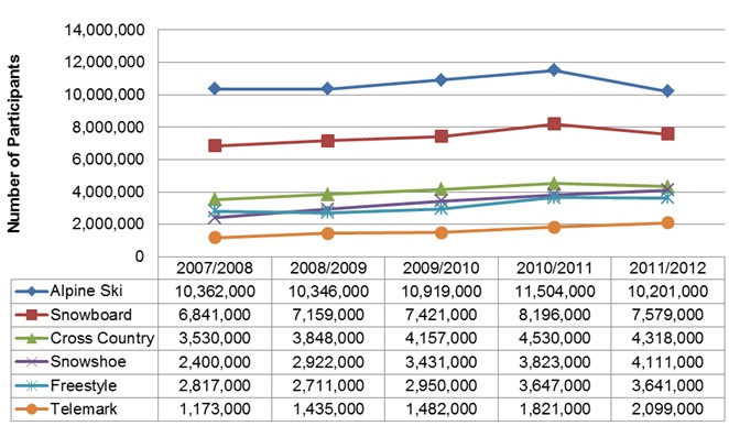 We’re guessing splitboarding would have been up as well if it had been tracked. When financial times are tough, we would expect more people to be taking to the backcountry and skipping the $100 a day lift tickets. Follow the jump for the official word from SIA.SIA Releases 2012 Participation Report