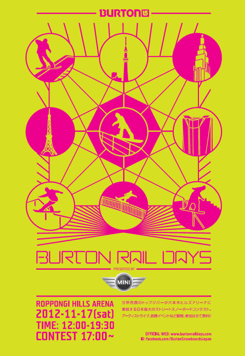 BURLINGTON, VT (November 8, 2012) Next week, Burton will bring the excitement of snowboarding to the heart of Tokyo with the presentation of Burton Rail Days, the largest outdoor snowboard event in the city’s history. Presented by MINI and taking place at Roppongi Hills Arena on Saturday, November 17, the second annual Burton Rail Days will bring top urban rail riders like Ethan Deiss, Zak Hale, Mark Sollors, Niels Schack, Ludwig Lejkner, Dylan Alito, Jamie Nicholls, Wojtek Pawlusiak, Brandon Hobush, Takahiro Ishida and more to Japan for an unforgettable snowboard and lifestyle event that promises to once again draw record-breaking crowds.