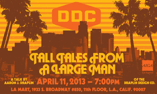 Using scientific proof and state-of-the-art multimedia techniques, Aaron James Draplin of the Draplin Design Co. delivers a sucker punch of a talk that aims to provide bonafide proof of work, the highs and lows of a ferociously independent existence and a couple of tall tales from his so-called career in the cutthroat world of contemporary graphic design. Just a regular American guy with a trajectory a little dirtier than yours, his talk is open to all incomers brave enough to show up. If you are a youngster, you may find yourself inspired to attack your design future in a different way. If you are established, you may just leave feeling grateful you don’t have anything to do with him. Hard to say. All Los Angeles champion citizens are invited to attend. Be there!