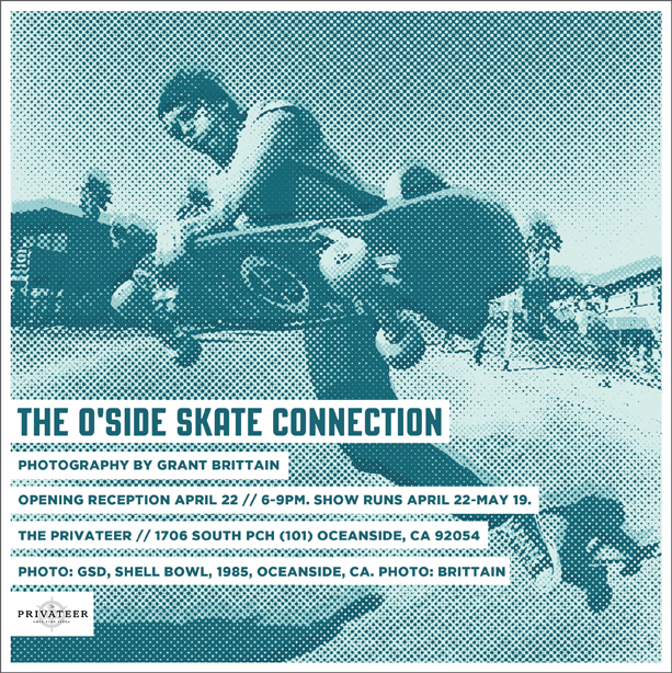 Legendary skateboarding photographer Grant Brittain will be opening a showing of his photos from the Oceanside, California skateboarding scene tonight, April 22, 2013, at The Privateer in Oceanside, California. The show titled The O-Side Skate Connection runs April 22 through May 19, 2013. The opening reception begins at 6 PM Monday, April 22, 2013. The Privateer (a great coal fired pizza restaurant) is located at 1706 South PCH 101, in Oceanside, California.