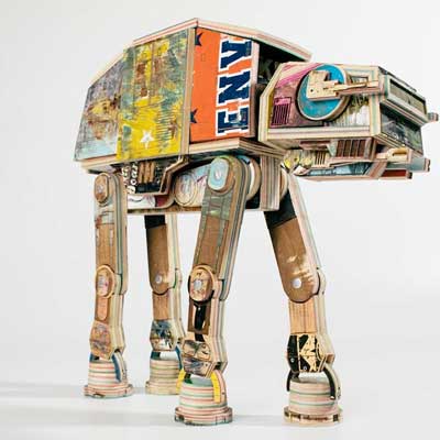 A new show titled Deathstar Blues at Denver, Colorado’s Blackbook Gallery features art (and commerce) from the intersection of skateboarding and Star Wars. Specifically Vans and Santa Cruz Skateboard’s new licensed Star Wars gear and some skateboarding art inspired by the seminal sci fi movies (like Derek Keenan’s AT-AT made entirely of upcycled skateboards on the right) .