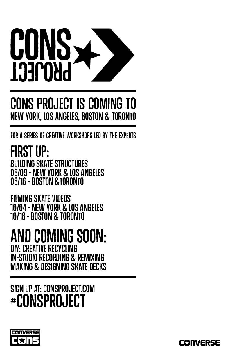 NORTH ANDOVER, MASS. – (JULY 24, 2014) – Today, CONVERSE Inc. announced the continuation of its North American CONS Project, a series of global community workshops designed to inspire the next generation of creative spirits through skate, art, and music workshops taking place in New York, Los Angeles, Boston, and Toronto. Demonstrating the brand’s continuous dedication to fueling creativity all over the globe, Converse will continue to bring to life the CONS Project story on a larger scale, activating five single workshops themes in each market throughout the course of the year.