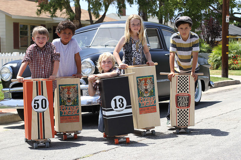 Utilizing high quality Baltic Birch and Canadian Maple for both the crate and modern skateboard deck, Skate Crate replaces the bone shaking metal wheels of old with smooth riding urethane cruiser wheels. The crates feature eyelet hooks to easily tie down a 12-pack, groceries, or a backpack inside the box. Vintage fruit crate labels, classic motorcycle racing, and car club designs were the influence for the fully-assembled Flying Tiger, Raceway, and Sidewalk Screamer models. The DIY kits come unassembled with racing-inspired decals available to encourage hands-on fun.