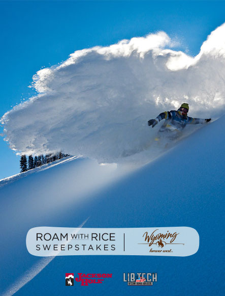 For those wanting to get up close and personal with Rice, Wyoming is giving fans a chance to ski or ride with Rice . . . Additional contest winners will receive a Wyoming branded, Rice designed, custom Lib Tech snowboard. Follow the conversation about the sweepstakes with the #RoamwithRice or enter the sweepstakes at: http://winter.wyomingtourism.org/sweepstakes/.