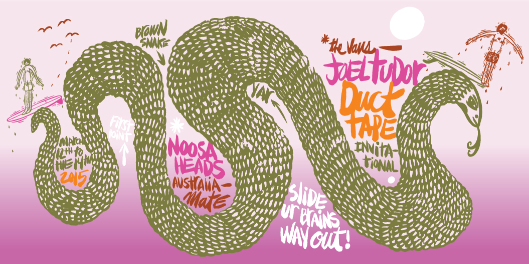 The Joel Tudor Duct Tape Invitational (poster by Thomas Campbell) presented by Vans returns to the Noosa Heads, Australia this weekend (March 13 – 15, 2015) as part of the historic Cricks Noosa Festival of Surfing. The world’s best traditional long boarders will exhibit their unique long boarding style for a piece of a $10,000 USD prize purse and the privilege to be a part of the celebrated heritage of the Noosa surf community.